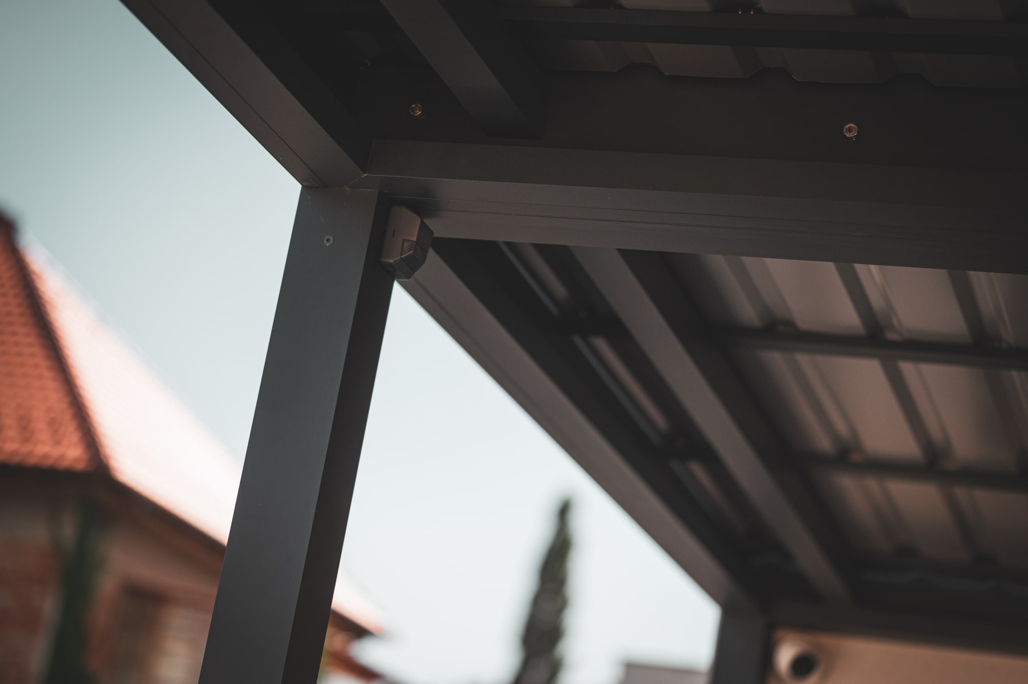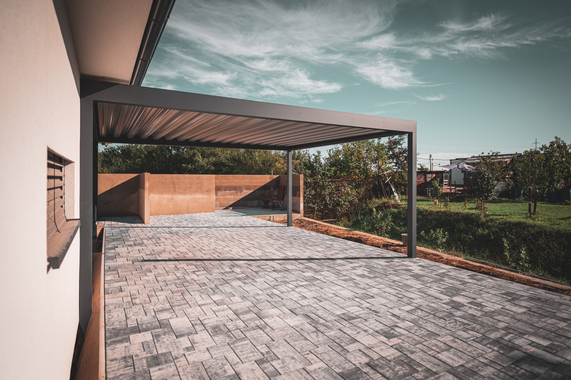 The combination of a horizontal structure covered with trapezoidal sheet metal boasts clean lines and provides protection for your car from the sun or adverse weather.