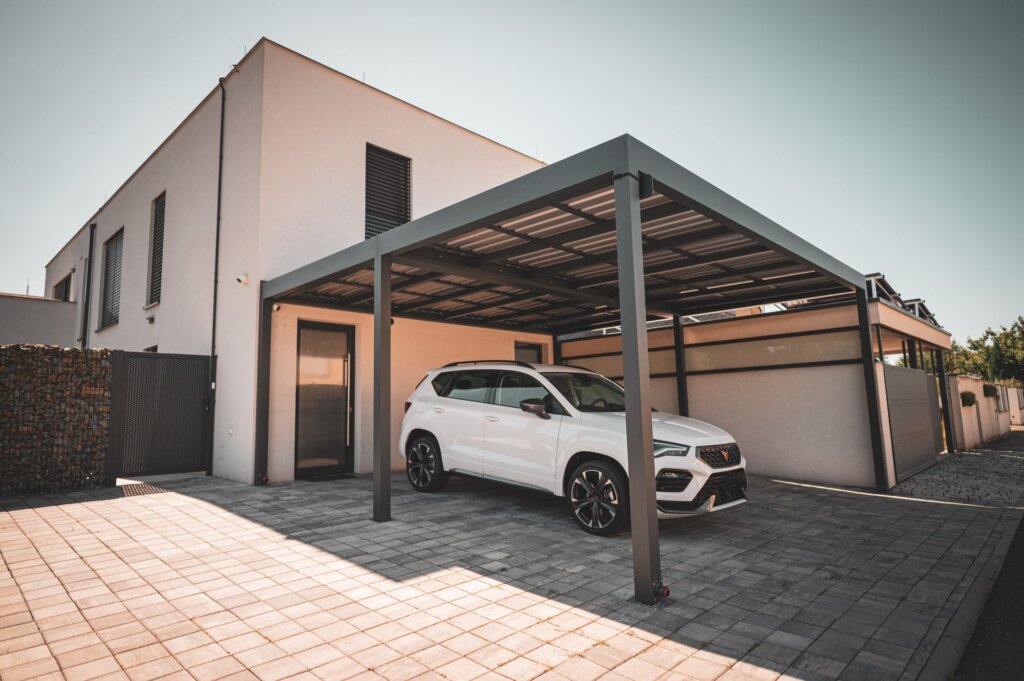 The aluminum car shelter from Alutech Bohemia, with its visually horizontal structure, perfectly complements modern buildings with clean lines. In addition to protecting the car from adverse weather, our customers especially appreciate the shape of the structure, which harmonizes perfectly with the design of pergolas that may already be installed on their terraces.