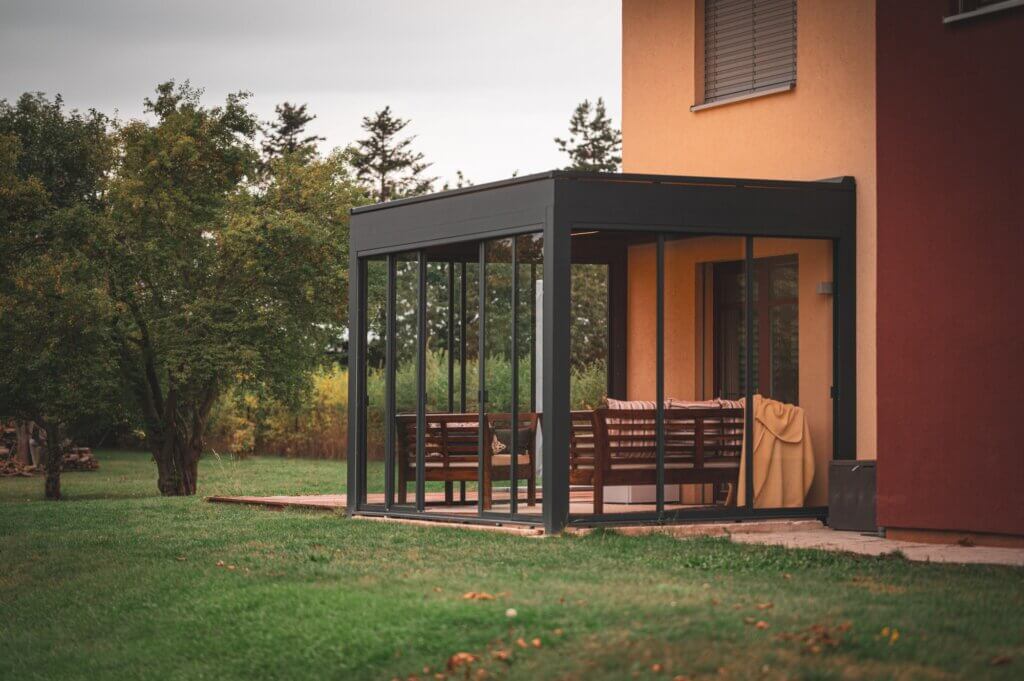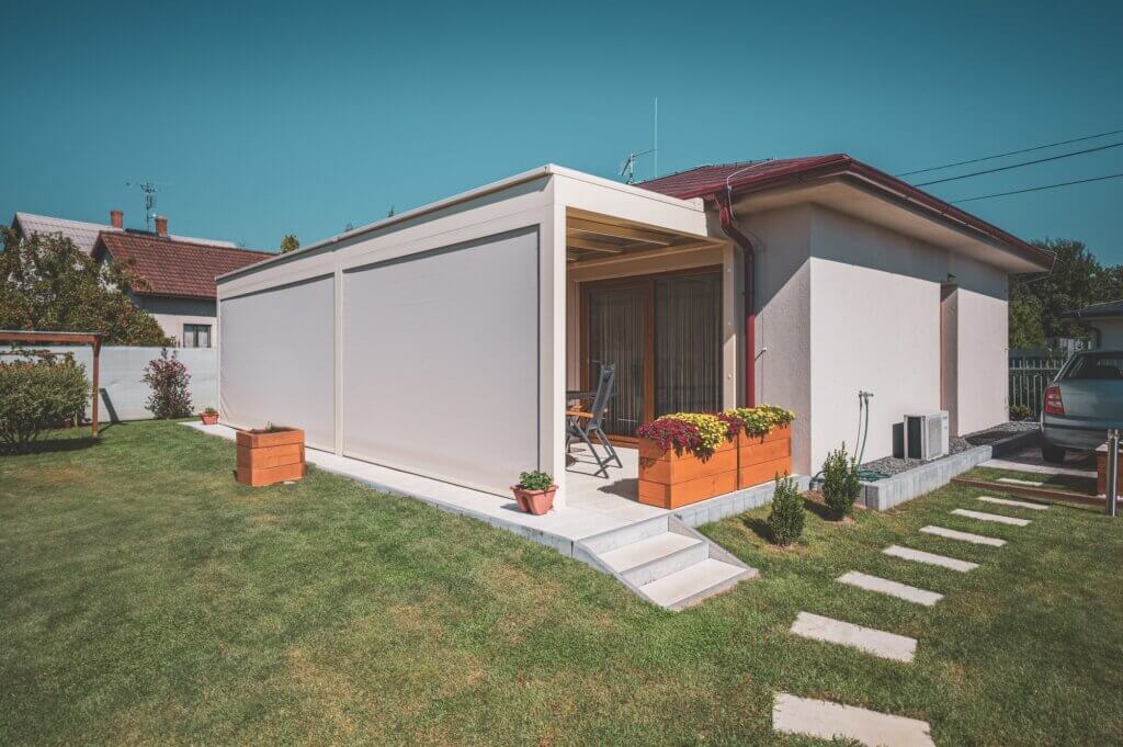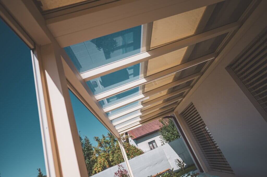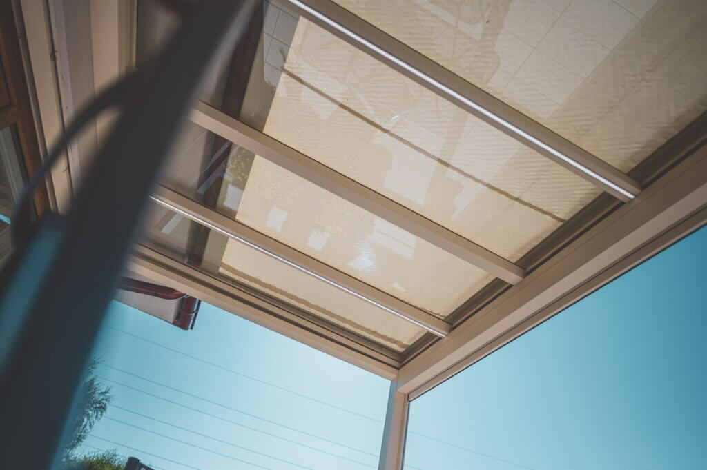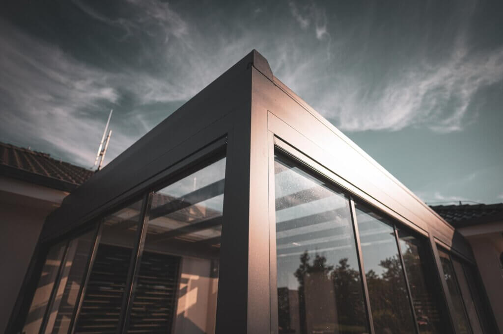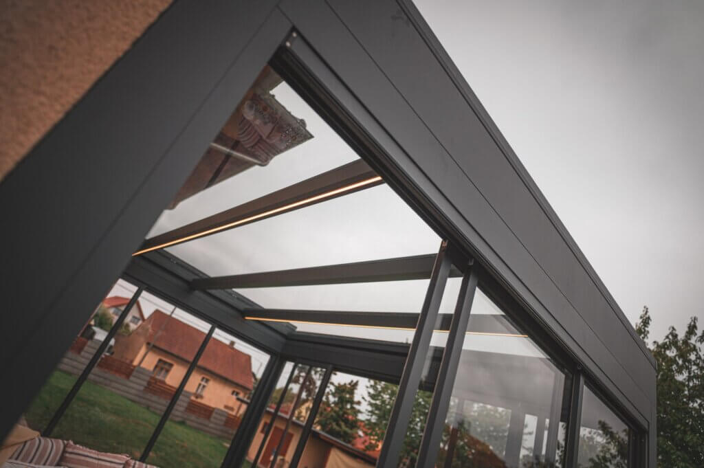 The Meridiem Glass pergola is the first product of its kind on our market to feature a completely flat structure with a glazed roof. The roofing is sloped within the structure, giving the pergola a unique modern design combined with the charm of cubist shapes. Naturally, the pergola includes an integrated gutter system that directs rainwater into the pergola’s support beam. Thanks to its robust construction, the pergola can withstand heavy loads, ensuring year-round use. An integrated roof blind and side sliding glazing are highly desirable additions to the Meridiem Glass pergola, while LED lighting and infrared heaters can also be valuable enhancements.